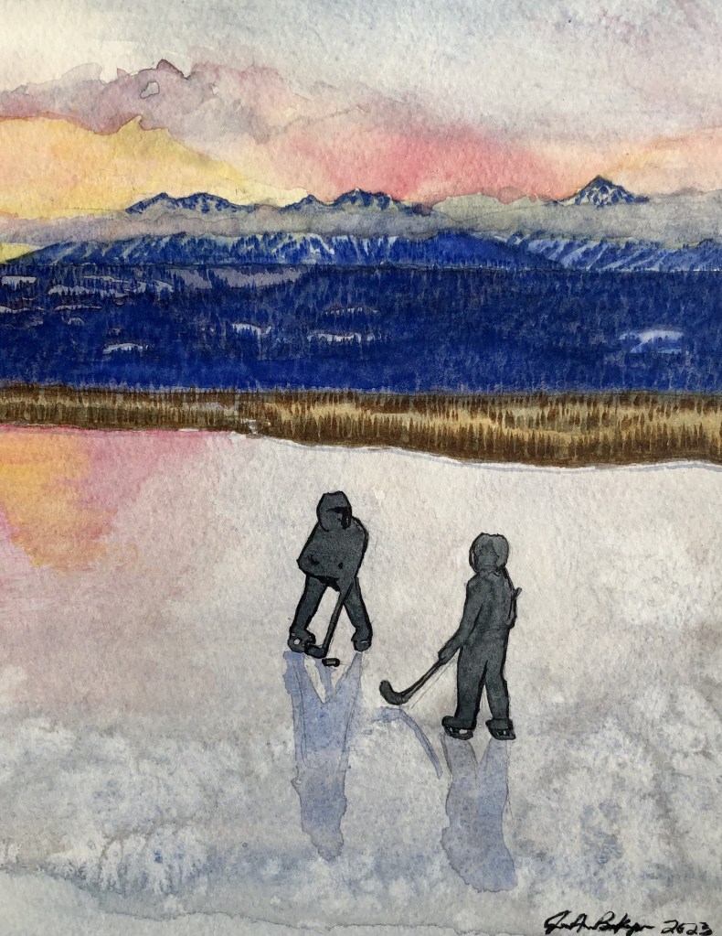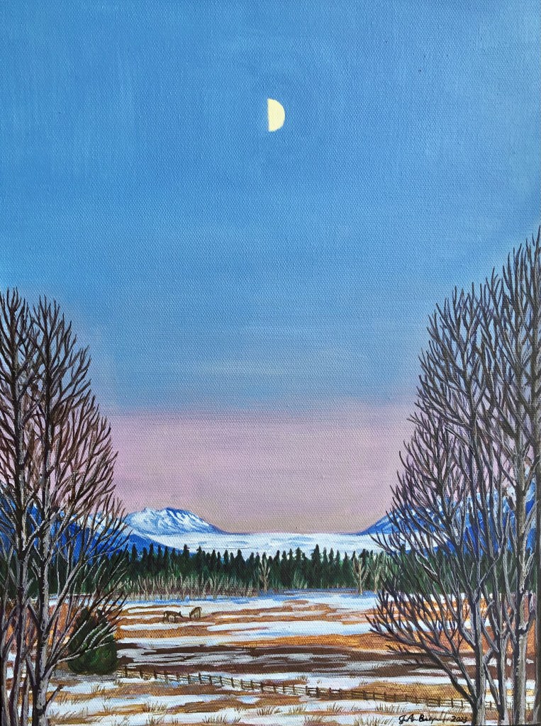 She grew up in a family of artists, where painting around the kitchen table with siblings was a regular source of entertainment. Her love of nature and the outdoors lead to traveling the world as a member of the Canadian National Mountain Bike Team, while also doing a science degree in Ecology and Evolution at Simon Fraser University. She later moved back home to Valemount, and taught high school there for a few years, before starting a family and taking over her grandparents’ farm. She recently rediscovered art and took up painting during the long cold winters, when the farm and garden rests.
