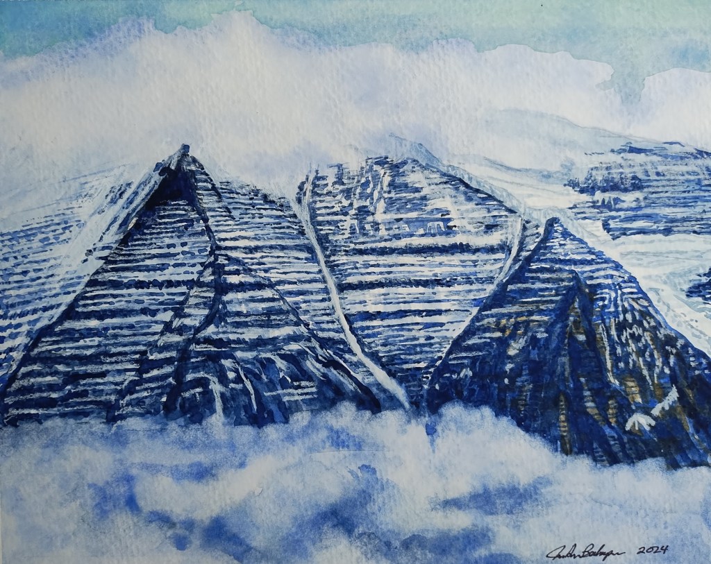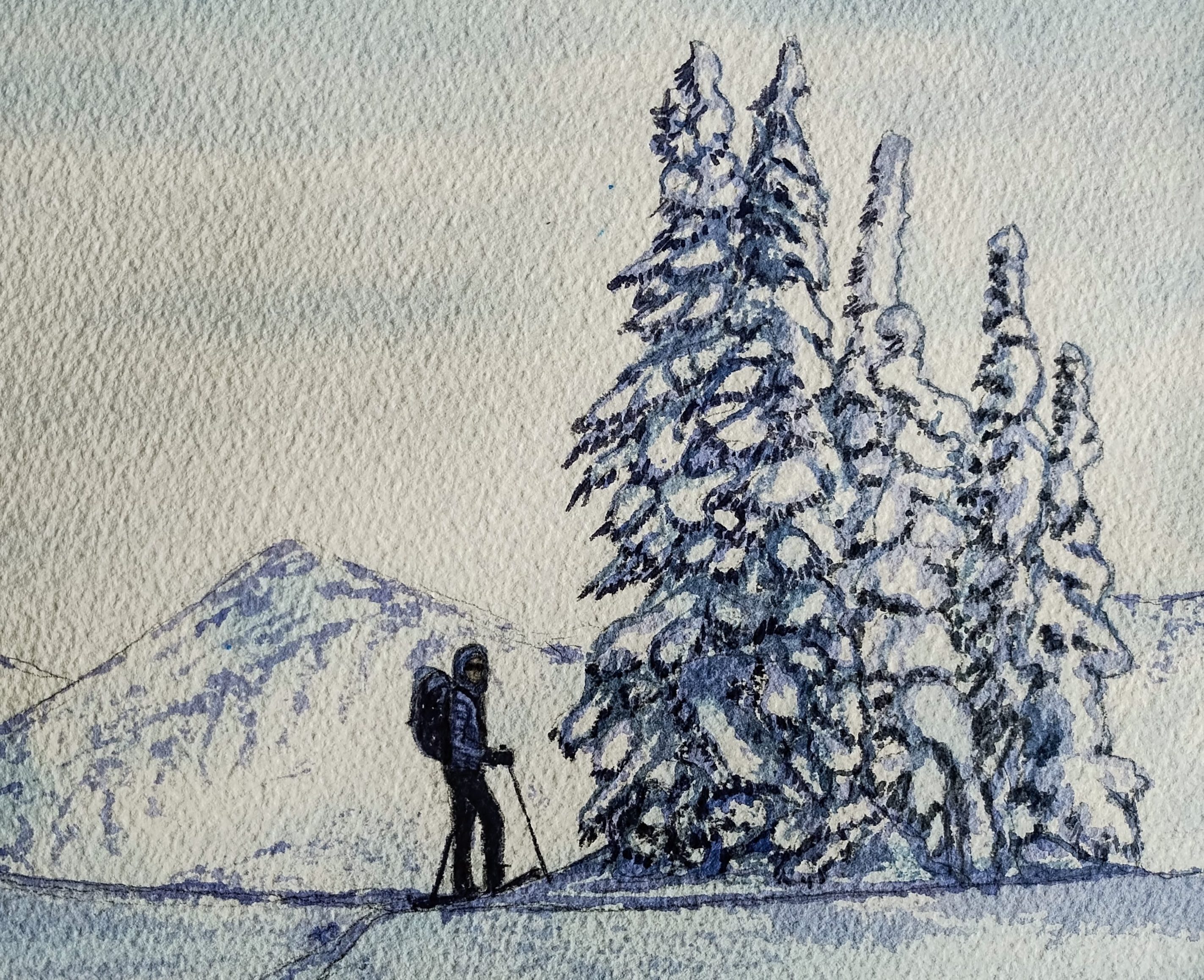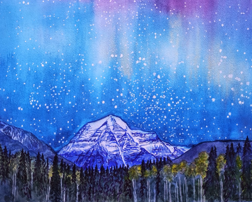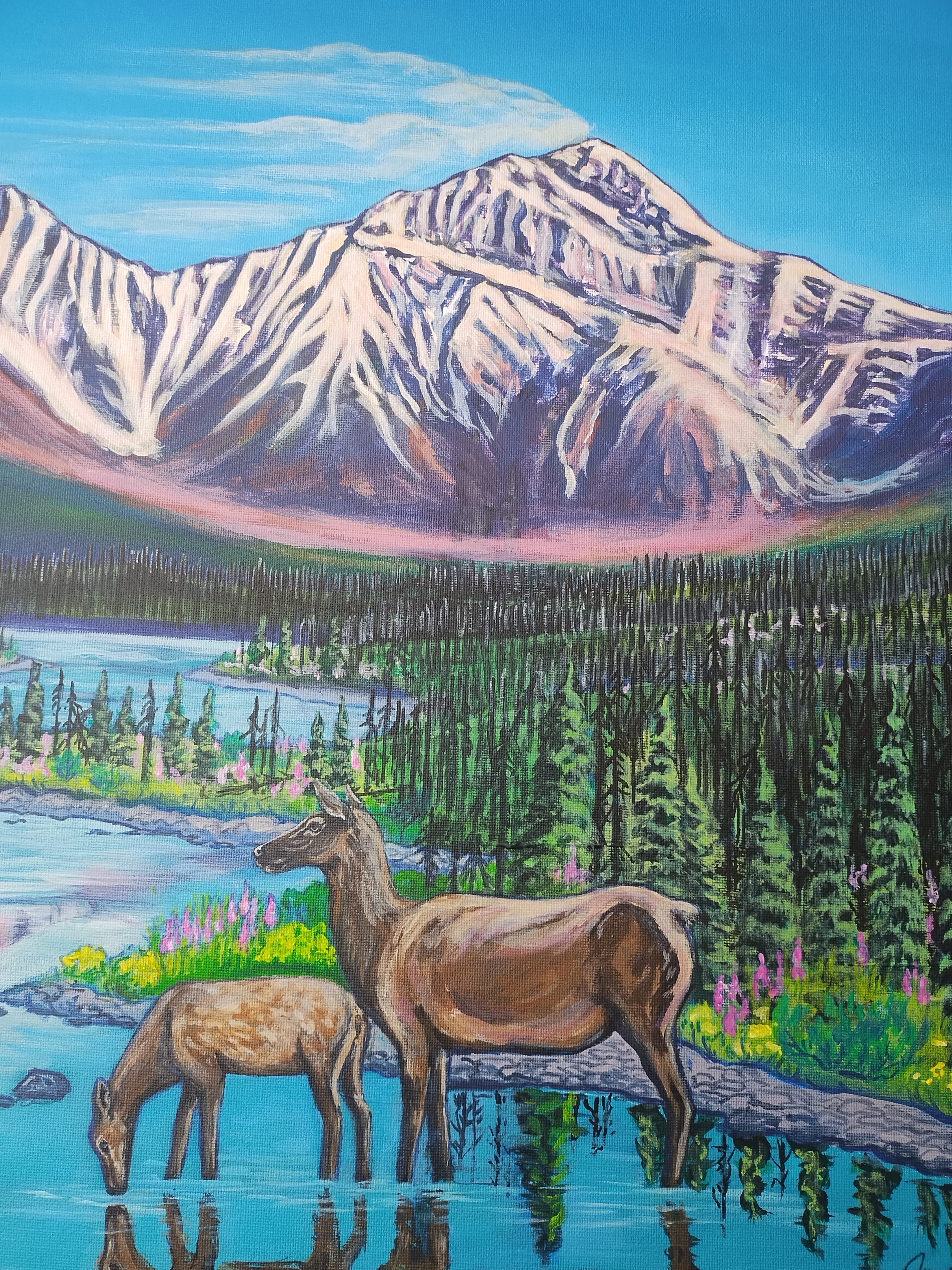 Her watercolor and acrylic paintings are inspired by the stunning beauty of nature, particularly the Canadian Rockies and mountains near her home. She combines both elements of realism and impressionism, with a vivid palette to meditate on the beauty of rugged mountains, and the people and wildlife that make that wilderness home. Through her art, she aims to draw viewers closer to nature, and connect them with the land and web of life that we are all a part of.